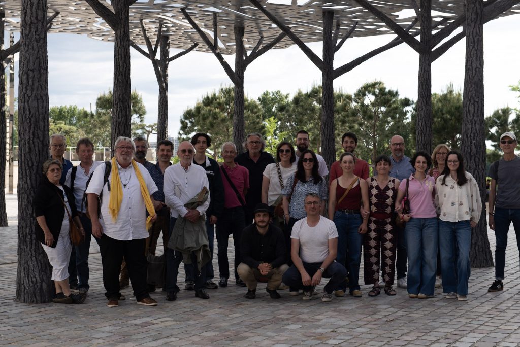 Alors que l’époque nous invite à courir, nous avons pris le temps d’être là. Vers 16 heures nous partons en ordre dispersé, qui en bus depuis la Place de la République, face au tribunal où nous n’avons heureusement aucun souvenir à raconter, qui à pied, qui sur son vélo-cargo de location, …. Nous passons le Pont de Pierre qui entrera en travaux le surlendemain et nous retrouvons au quartier du Belvédère, avec la famille Gertoux, François et Muriel, Benoit, Elena et leurs filles, Camille et Adrien, pour faire une bonne pause, d’abord en plein soleil, sur la terrasse d’un bar faite de tables et de bancs comme on en trouve lors de fêtes populaires. La disposition elle-même du lieu donne envie d’être là, un peu comme en Espagne, sur la place qui fait le lien avec le Pont Saint-Jean que nous traversons pour passer devant les travaux de la future rue de la Canopée. Nous faisons un crochet rue Morion où la famille de Jean-Louis a habité plusieurs années et rejoignons à nouveau la rue Terres-de-Bordes qui longe la gare Saint-Jean juste au moment où Maylis, fille de Thomas, descend du train.