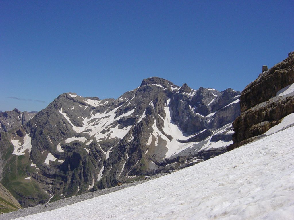 Du sommet du Marboré nous voyons, plein ouest, le refuge des sarradets, minuscule. Il est à 4,5 km à vol d’oiseau, mais nous ne sommes pas des oiseaux. Nous redescendons pour passer au pied de chacun des sommets que nous avons gravis et, contournant le dernier, le Pic de l’Épaule, nous remontons facilement jusqu’au Col de la Cascade. Depuis-là, en marchant sur la crête, je suggère de passer par la Tour du Marboré (3009 m) pour redescendre vers l’ouest assez facilement, ce qui ne m’empêche pas de chuter sans dégâts au bas d’un court névé. Le chemin remonte ensuite vers la brèche de Roland. Le soleil nous brûle le côté gauche et peu à peu nous fait face. Franchie la brèche, nous redescendons au refuge récupérer les affaires de la nuit. M’asseyant, je fonds en larmes, je me vide alors que j’ai subi me semble-t-il une insolation, et les larmes ne cessent pas. Je fais ça aussi discrètement que possible même si je ne contrôle rien. Eric me dira quelques années plus tard n’avoir rien aperçu.