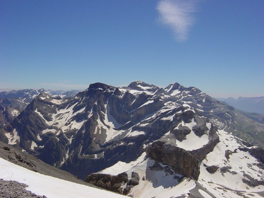 Du col de la cascade nous contournons par le sud le Pic de l’Epaule pour remonter sur la crête d’ouest en est, d’abord sur le premier pic et nous enfilons ensuite le Pic Occidental (3095), le Pic Brulle (3111) et le Pic oriental de la cascade (3161 m). Nous nous posons un peu plus longuement que sur les autres sommets sur le Pic Central, Pic Brulle. Je ne sais si c’est là où plutôt sur le Pic oriental que nous voyons, proche de nous, le sommet suivant, le Pic du Marboré (3248), vaste plateau sur lequel on pourrait faire manœuvrer un bataillon disait Russel. « Tu y es déjà allé ? » Dis-je. Devant la réponse négative et n’écoutant que mon désir de performance tout en voulant saisir l’opportunité, nous y allons. ¾ d’heure environ. Chaque fois que nous redescendons d’un sommet, nous perdons entre 50 et 100 mètres d’un dénivelé qu’il nous faudra récupérer ensuite !